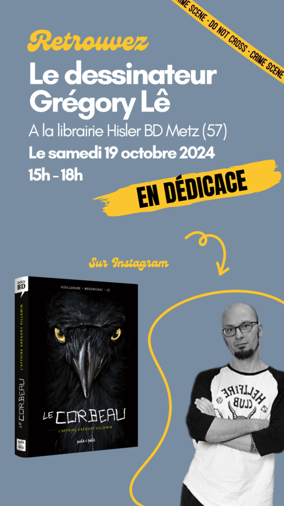 Retrouvez le dessinateur Grégory Lê en dédicace le samedi 19 octobre 2024 à la librairie Hisler BD à Metz, à l’occasion de la sortie événement du Docu-BD « Le corbeau L’affaire Grégory Villemin »