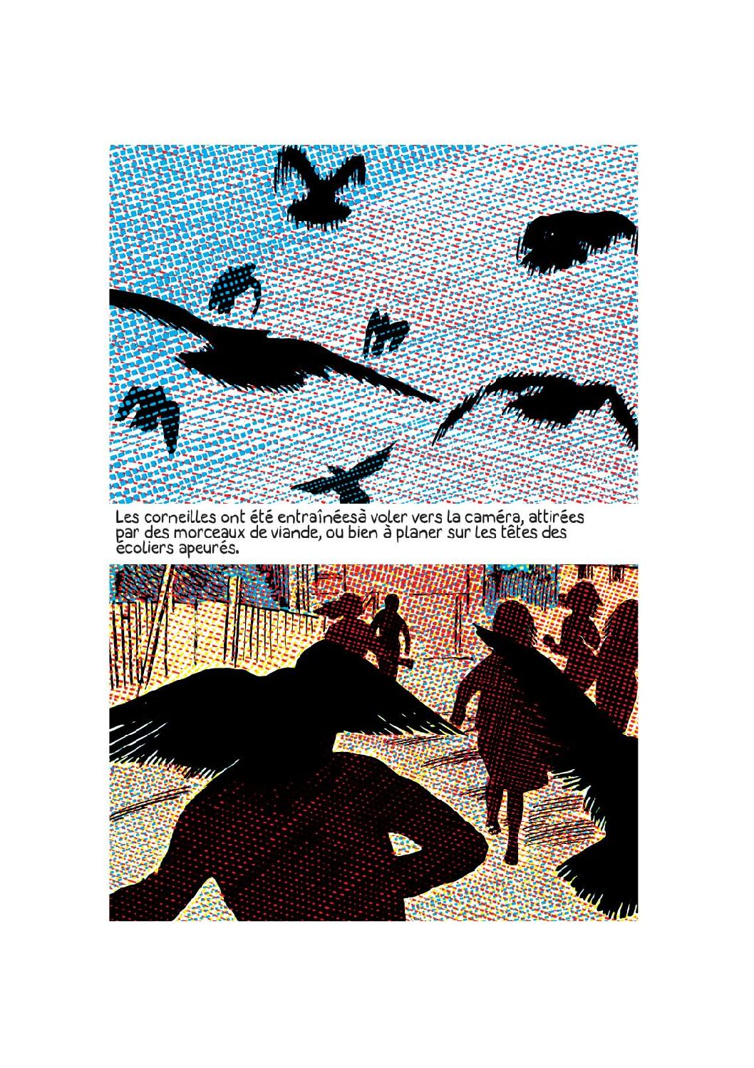 Se remémorant l’anecdote selon laquelle Rod Taylor, l’acteur principal des Oiseaux d’Hitchcock, aurait durant tout le tournage été harcelé par l’une des corneilles utilisées pour le film, Giacomo Nanni part du postulat selon lequel l’animal est capable d’identifier et de se souvenir des visages humains. De là, il imagine l’une d’elles en témoin des préparatifs d’attentat de la filière jihadiste dite « des Buttes-Chaumont », suspecte des attentats survenus en France en janvier 2015. Il reprend pour ce faire le procédé si original et poétique déployé dans Acte de Dieu de l’enchaînement et du croisement des regards et points de vue. La vision d’une corneille a la même valeur que celle d’une petite fille, le Parc des Buttes-Chaumont comme le piège à corneilles deviennent des protagonistes à part entière. Selon Giacomo Nanni, le but de cette histoire n’est « pas seulement de raconter la violence d’un attentat terroriste, mais aussi d’évoquer la brutalité des faits par rapport à l’invention littéraire et artistique ».